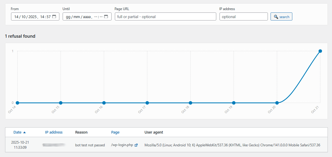 It displays IP addresses, timestamps, and the specific pages targeted, helping you identify recurring attack patterns or suspicious behavior. This visibility allows you to understand potential threats and take action proactively.